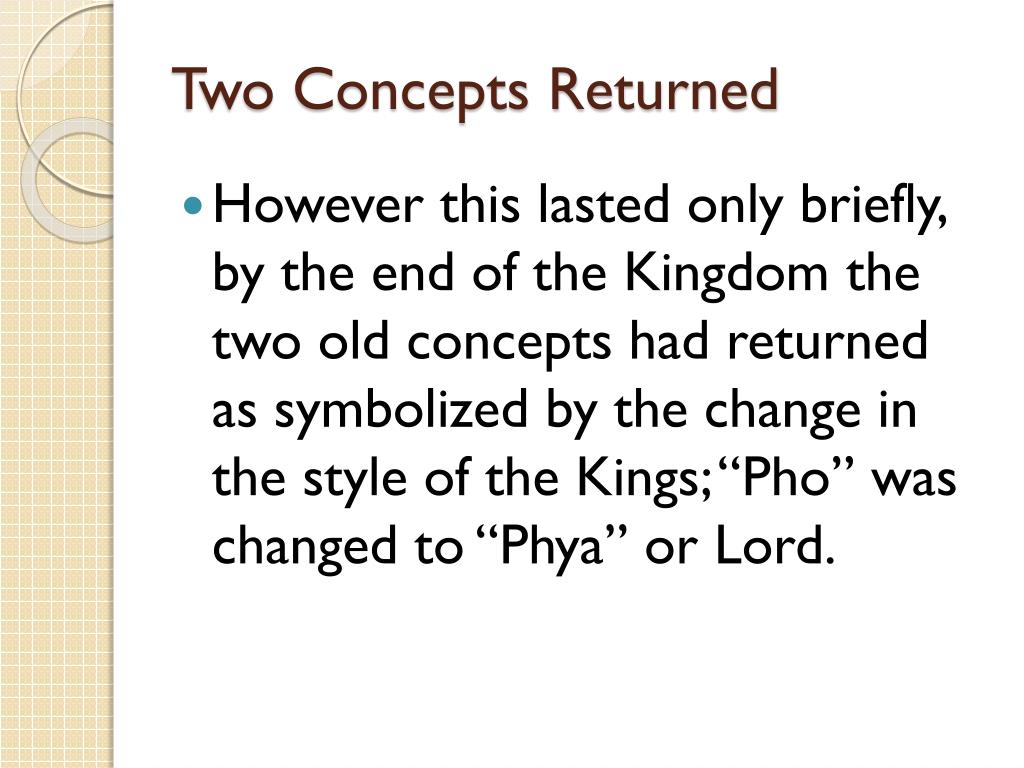 Two Concepts Returned • However this lasted only briefly, by the end of the Kingdom the two old concepts had returned as symbolized by the change in the style of the Kings; “Pho” was changed to “Phya” or Lord.