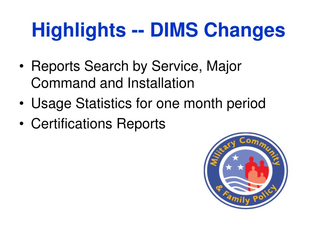 Highlights -- DIMS Changes • Reports Search by Service, Major Command and Installation • Usage Statistics for one month period • Certifications Reports