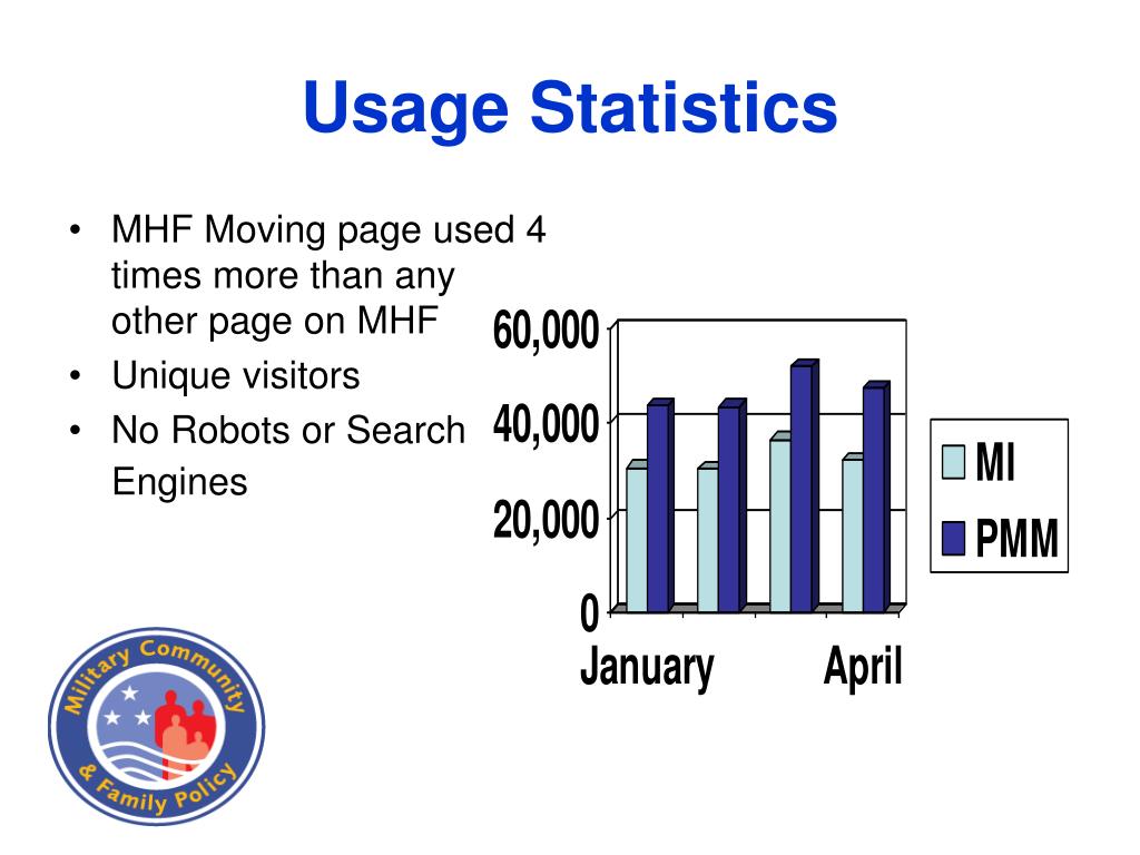 Usage Statistics • MHF Moving page used 4 times more than any other page on MHF • Unique visitors • No Robots or Search Engines