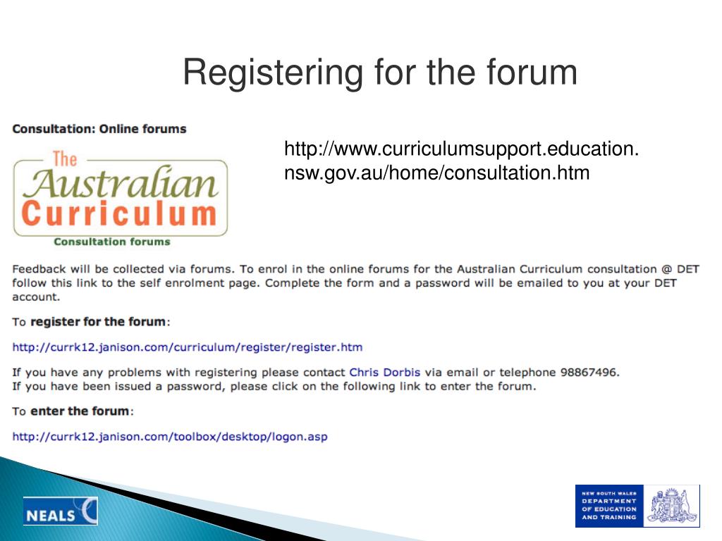 Registering for the forum http://www.curriculumsupport.education.nsw.gov.au/home/consultation.htm