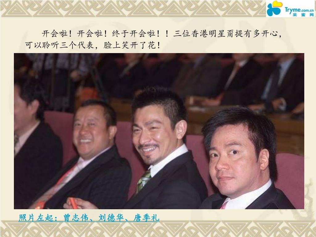 开会啦!开会啦!终于开会啦!!三位香港明星甭提有多开心,可以聆听三个代表,脸上笑开了花!开会啦!开会啦!终于开会啦!!三位香港明星甭提有多开心,可以聆听三个代表,脸上笑开了花! 照片左起:曾志伟、刘德华、唐季礼