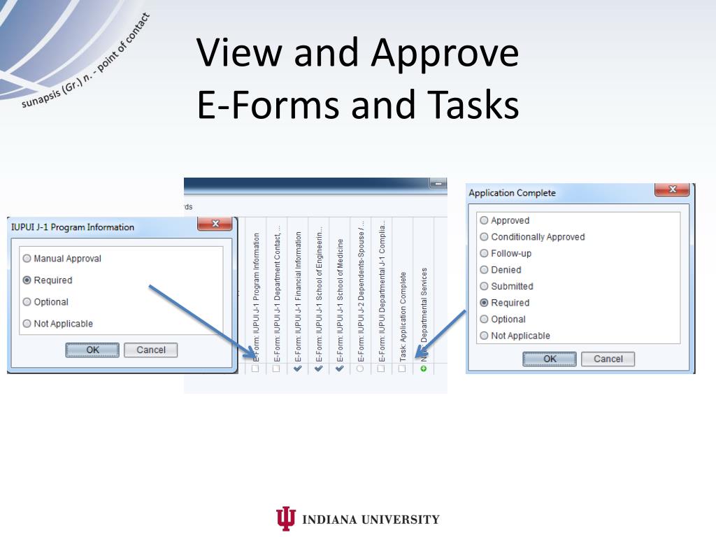 Overview • Current Use • E-Form Groups J-1, H-1B, O-1, TN and PR • E-Form Based • Keystone E-Form • Scholar completed E-Forms as a limited user • Alert Driven • E-Form based alerts • Manual Monitoring of Processes • Indiana University as a Case Study