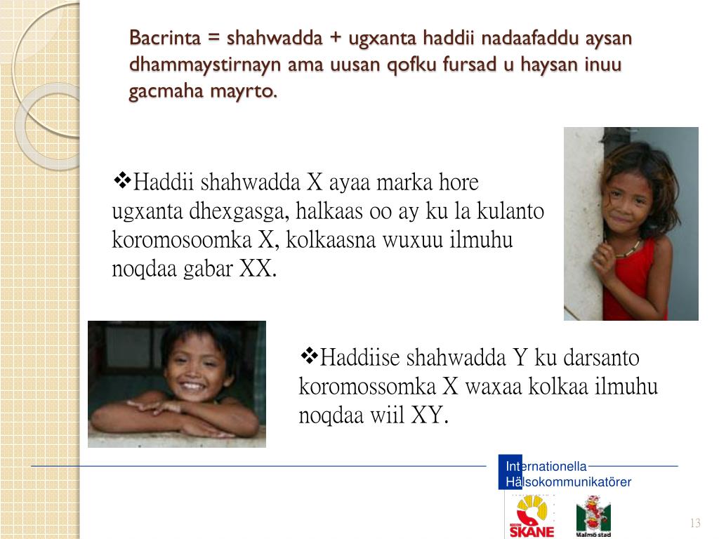 Wiil mise gabar? • Waxaa hidde-jinsiyeedkeennu ay ku urursan yihiin koromosoomada. • Ugxanta waxaa ku jira 23 koromosoom oo X ah. • Shahwadduna waxay ka kooban tahay 23 koromosoom • Unugyada shahwaddu waxay u qaybsan yihiin labo, nus waxa weeye koromosoomada X, nuska kale koromosoomada Y.
