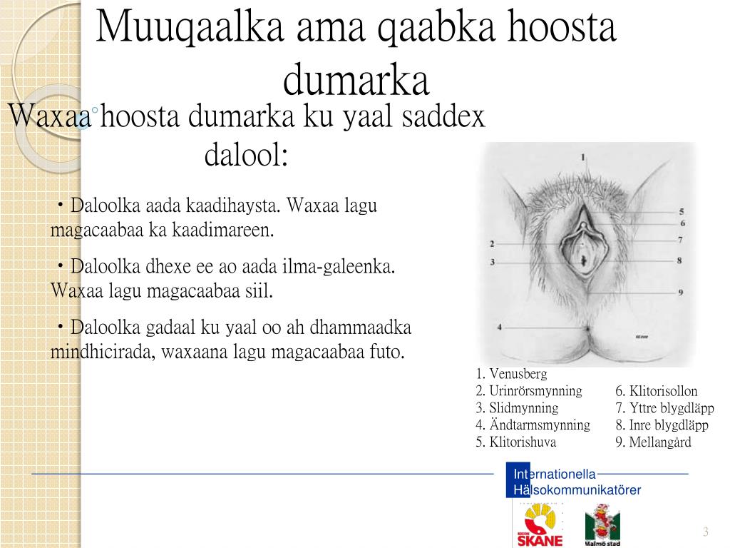 Xanuunada hoosta dumarka • Xanuuneysa agagaarka iyo gudaha hoosta dumarka ama luqunta ilmagaleenka • Haddii xanuunku soo noqnoqdo ama kordho, waa in la la xiriiraa dhakhtarka
