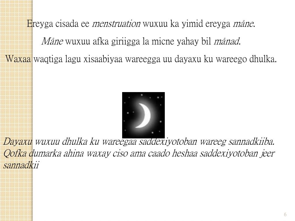 Ciso ama caado- Awoodda nololi ku abooranto- Tallaabada ugun horreysa ee naag lagu noqdo GOORMA? Waxay gabdhaha cisada ama caadada ugu horreysa helaan inta u dhexeysa 9 iyo 17 sano jir. Kolkaa waxaa weynaada naasaha oo miisaankooda ayaa gaara in ku filan. IMMISA GOOR? Qiyaastii bishiiba hal mar. IMMISA MAALMOOD AYUU SOCDAA? Waxay u kala dhexeysaa 3 ilaa 7 maalmood. GOORMA AYEY CISADU ISTAAGTAA? Kolka qofka dumarka ahi hareeraha 50 sano.