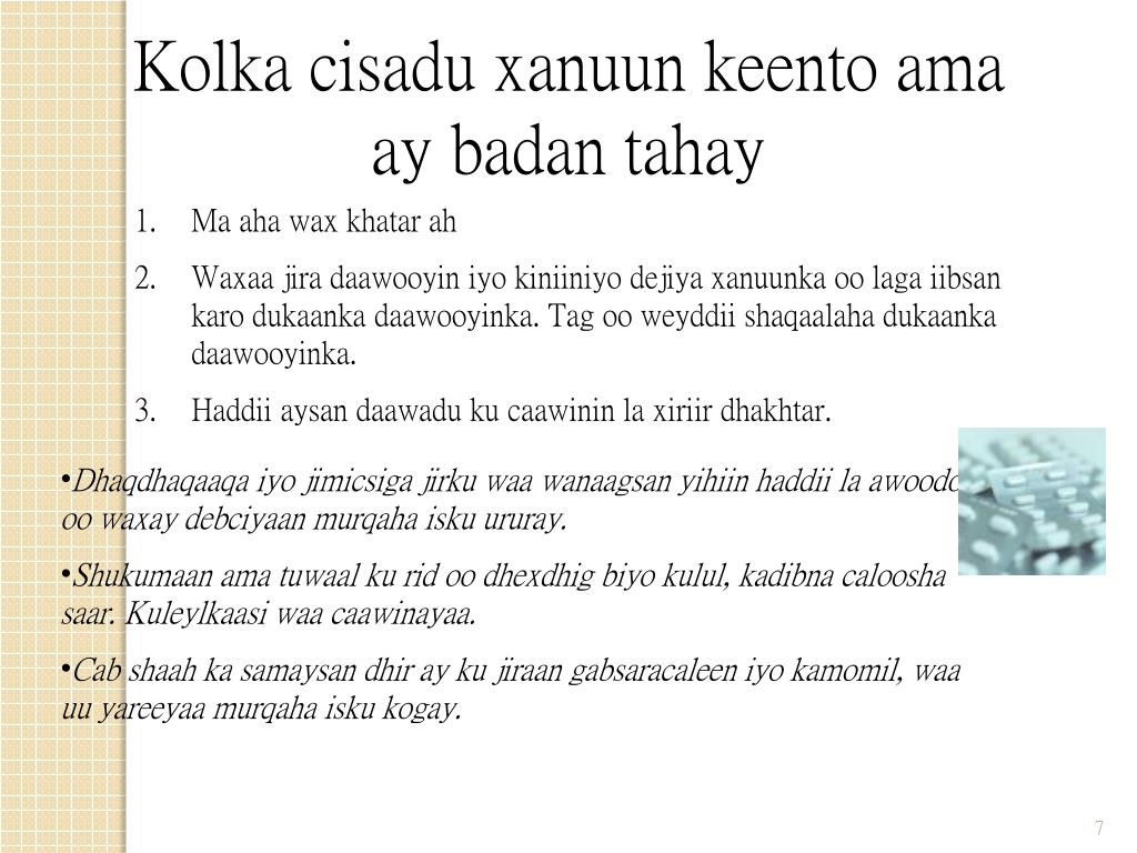 Kolka cisadu xanuun keento ama ay badan tahay • Ma aha wax khatar ah • Waxaa jira daawooyin iyo kiniiniyo dejiya xanuunka oo laga iibsan karo dukaanka daawooyinka. Tag oo weyddii shaqaalaha dukaanka daawooyinka. • Haddii aysan daawadu ku caawinin la xiriir dhakhtar. • Dhaqdhaqaaqa iyo jimicsiga jirku waa wanaagsan yihiin haddii la awoodo oo waxay debciyaan murqaha isku ururay. • Shukumaan ama tuwaal ku rid oo dhexdhig biyo kulul, kadibna caloosha saar. Kuleylkaasi waa caawinayaa. • Cab shaah ka samaysan dhir ay ku jiraan gabsaracaleen iyo kamomil, waa uu yareeyaa murqaha isku kogay.