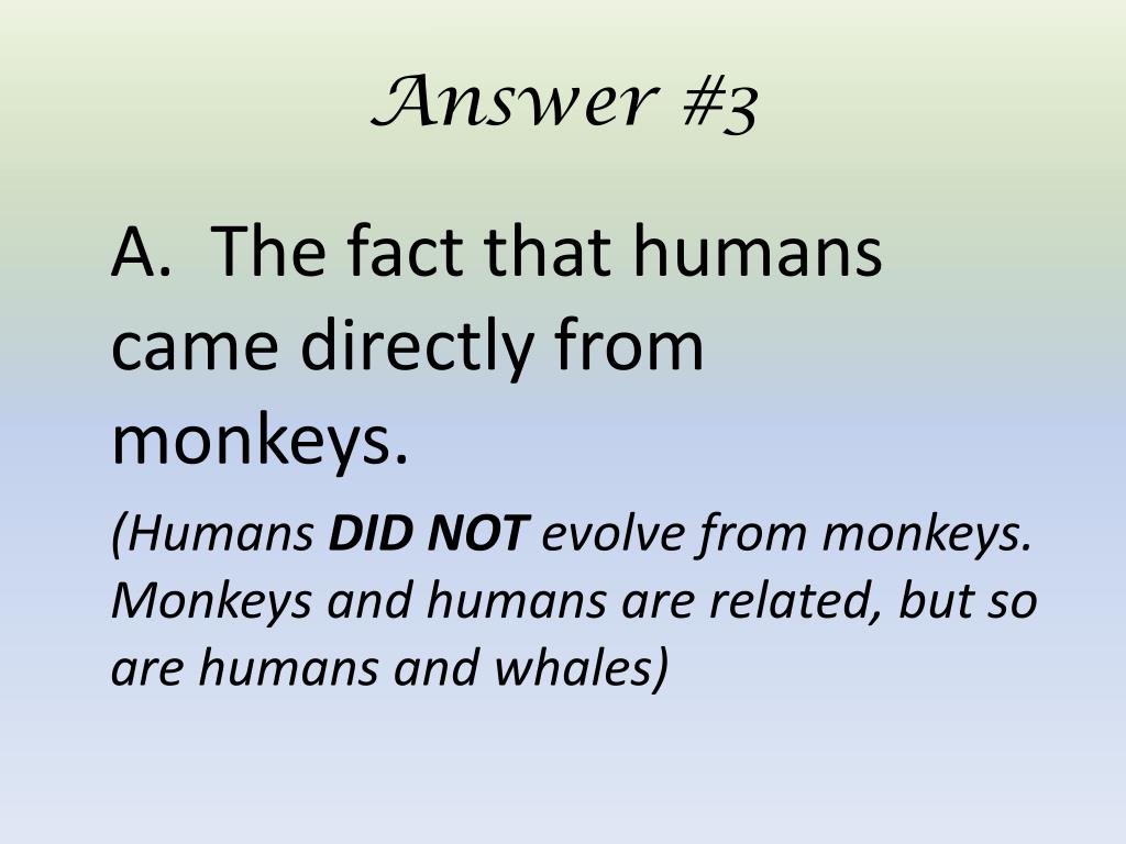 Answer #3 A. The fact that humans came directly from monkeys. (Humans DID NOT evolve from monkeys. Monkeys and humans are related, but so are humans and whales)