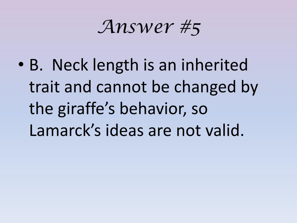 Answer #5 • B. Neck length is an inherited trait and cannot be changed by the giraffe’s behavior, so Lamarck’s ideas are not valid.