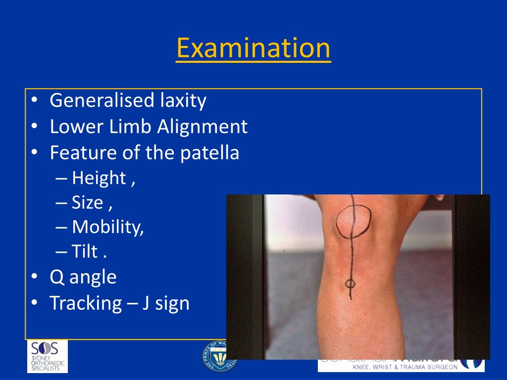 Examination • Generalised laxity • Lower Limb Alignment • Feature of the patella • Height , • Size , • Mobility, • Tilt . • Q angle • Tracking – J sign