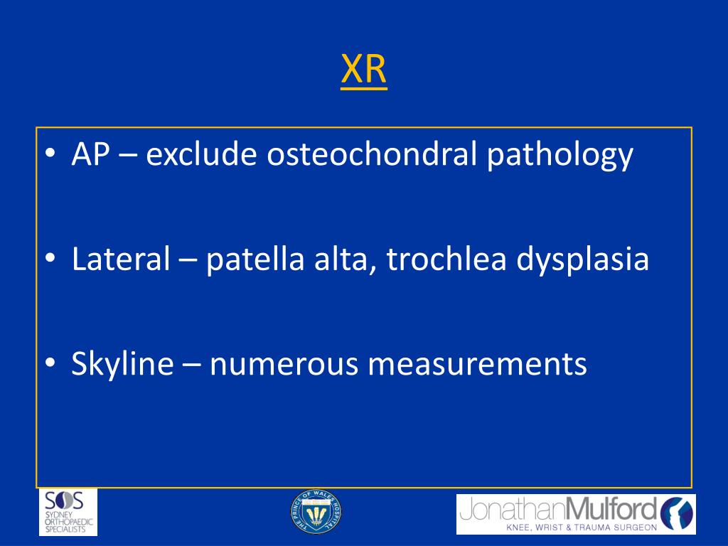XR • AP – exclude osteochondral pathology • Lateral – patella alta, trochlea dysplasia • Skyline – numerous measurements