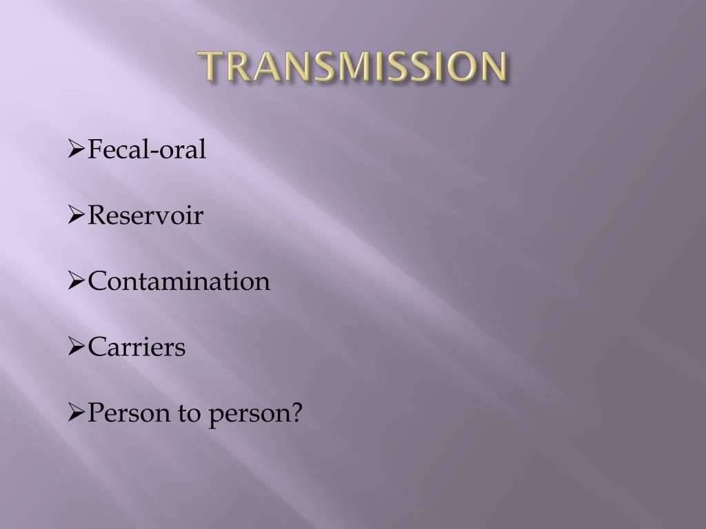 TRANSMISSION • Fecal-oral • Reservoir • Contamination • Carriers • Person to person?