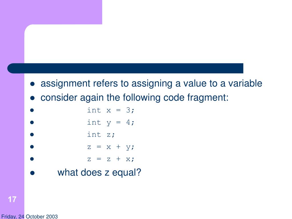 assignment refers to assigning a value to a variable • consider again the following code fragment: • int x = 3; • int y = 4; • int z; • z = x + y; • z = z + x; • what does z equal? 17 Friday, 24 October 2003
