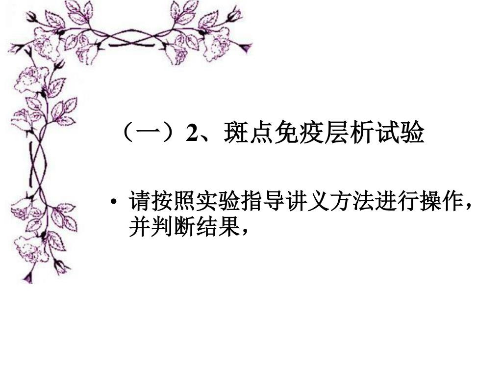 (一)免疫标记技术1、酶联免疫吸附试验 (ELISA)------双抗体夹心法 请按照实验指导讲义方法进行操作,第5-9步; 第5、7步孵育时间由60min改为30min; 结果肉眼判断 第5步按下页PPT的图加样,加6个孔,37℃,30分钟,(实验课开始时已做,接着做第6步,洗板)