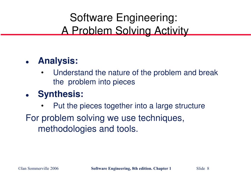 Software Engineering: A Problem Solving Activity • Analysis: • Understand the nature of the problem and break the problem into pieces • Synthesis: • Put the pieces together into a large structure For problem solving we use techniques, methodologies and tools.
