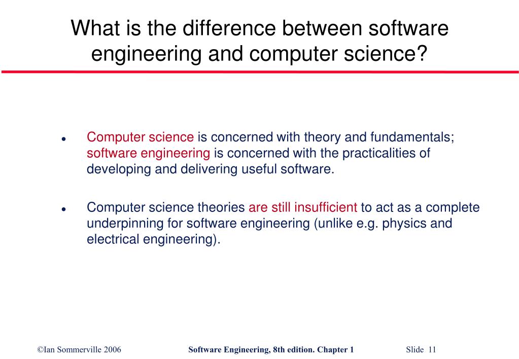 What is the difference between software engineering and computer science? • Computer science is concerned with theory and fundamentals; software engineering is concerned with the practicalities of developing and delivering useful software. • Computer science theories are still insufficient to act as a complete underpinning for software engineering (unlike e.g. physics and electrical engineering).