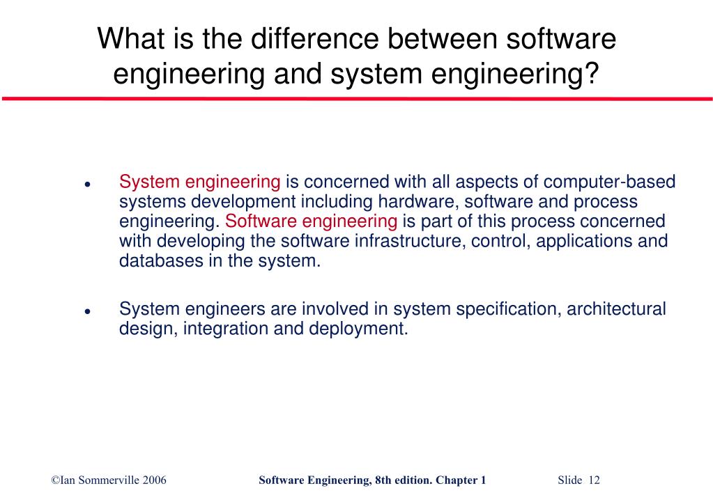 What is the difference between software engineering and system engineering? • System engineering is concerned with all aspects of computer-based systems development including hardware, software and process engineering. Software engineering is part of this process concerned with developing the software infrastructure, control, applications and databases in the system. • System engineers are involved in system specification, architectural design, integration and deployment.