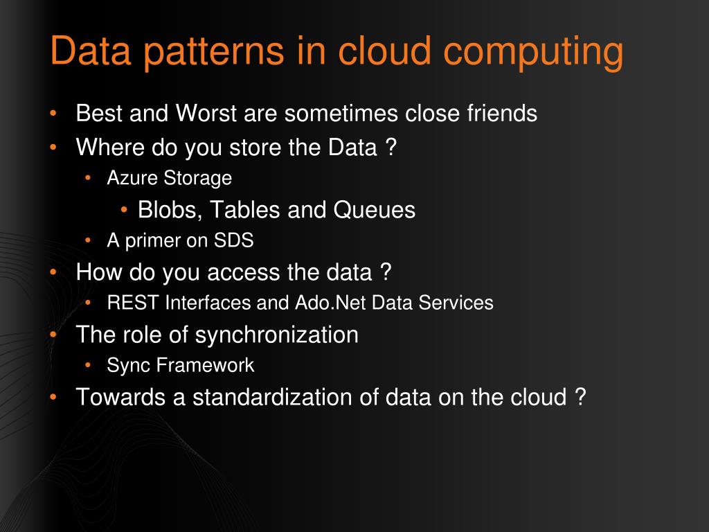 Data patterns in cloudcomputing • Best and Worst are sometimes close friends • Where do you store the Data ? • Azure Storage • Blobs, Tables and Queues • A primer on SDS • How do youaccess the data ? • REST Interfaces and Ado.Net Data Services • The role of synchronization • Sync Framework • Towards a standardization of data on the cloud ?