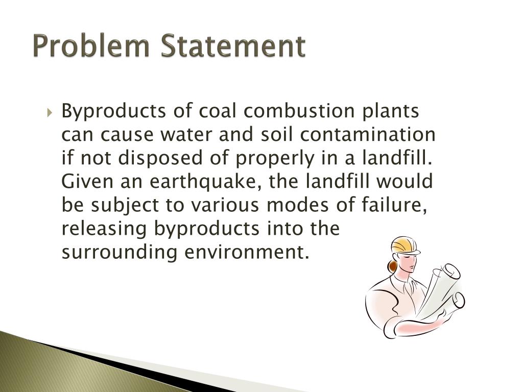 Problem Statement • Byproducts of coal combustion plants can cause water and soil contamination if not disposed of properly in a landfill. Given an earthquake, the landfill would be subject to various modes of failure, releasing byproducts into the surrounding environment.