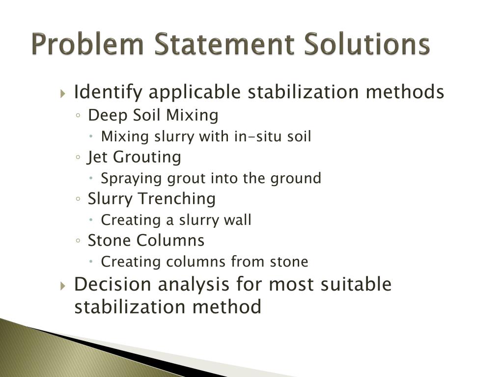 Problem Statement Solutions • Identify applicable stabilization methods • Deep Soil Mixing • Mixing slurry with in-situ soil • Jet Grouting • Spraying grout into the ground • Slurry Trenching • Creating a slurry wall • Stone Columns • Creating columns from stone • Decision analysis for most suitable stabilization method