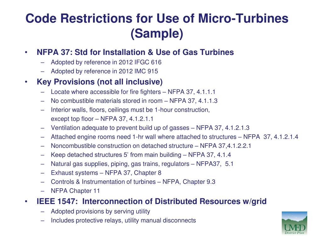 Code Restrictions for Use of Micro-Turbines (Sample) • NFPA 37: Std for Installation & Use of Gas Turbines • Adopted by reference in 2012 IFGC 616 • Adopted by reference in 2012 IMC 915 • Key Provisions (not all inclusive) • Locate where accessible for fire fighters – NFPA 37, 4.1.1.1 • No combustible materials stored in room – NFPA 37, 4.1.1.3 • Interior walls, floors, ceilings must be 1-hour construction, except top floor – NFPA 37, 4.1.2.1.1 • Ventilation adequate to prevent build up of gasses – NFPA 37, 4.1.2.1.3 • Attached engine rooms need 1-hr wall where attached to structures – NFPA 37, 4.1.2.1.4 • Noncombustible construction on detached structure – NFPA 37,4.1.2.2.1 • Keep detached structures 5’ from main building – NFPA 37, 4.1.4 • Natural gas supplies, piping, gas trains, regulators – NFPA37, 5.1 • Exhaust systems – NFPA 37, Chapter 8 • Controls & Instrumentation of turbines – NFPA, Chapter 9.3 • NFPA Chapter 11 • IEEE 1547: Interconnection of Distributed Resources w/grid • Adopted provisions by serving utility • Includes protective relays, utility manual disconnects