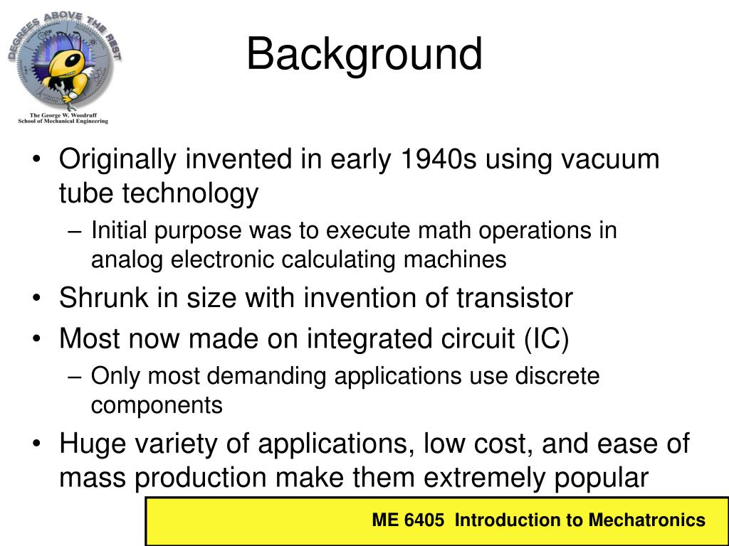 Originally invented in early 1940s using vacuum tube technology Initial purpose was to execute math operations in analog electronic calculating machines Shrunk in size with invention of transistor Most now made on integrated circuit (IC) Only most demanding applications use discrete components Huge variety of applications, low cost, and ease of mass production make them extremely popular Background