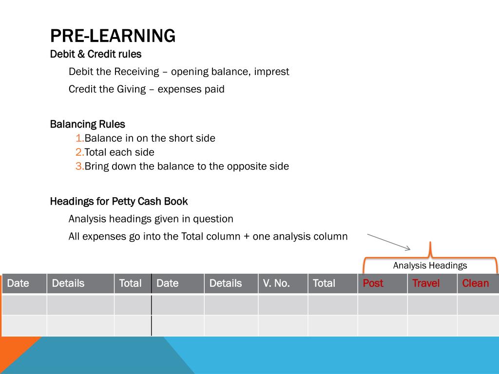 PETTY CASH BOOK. Pre-Learning. Debit & Credit rules Debit the Receiving – opening balance, imprest Credit the Giving – expenses paid Balancing Rules Balance in on the short side Total each side Bring down the balance to the opposite side Headings for Petty Cash Book