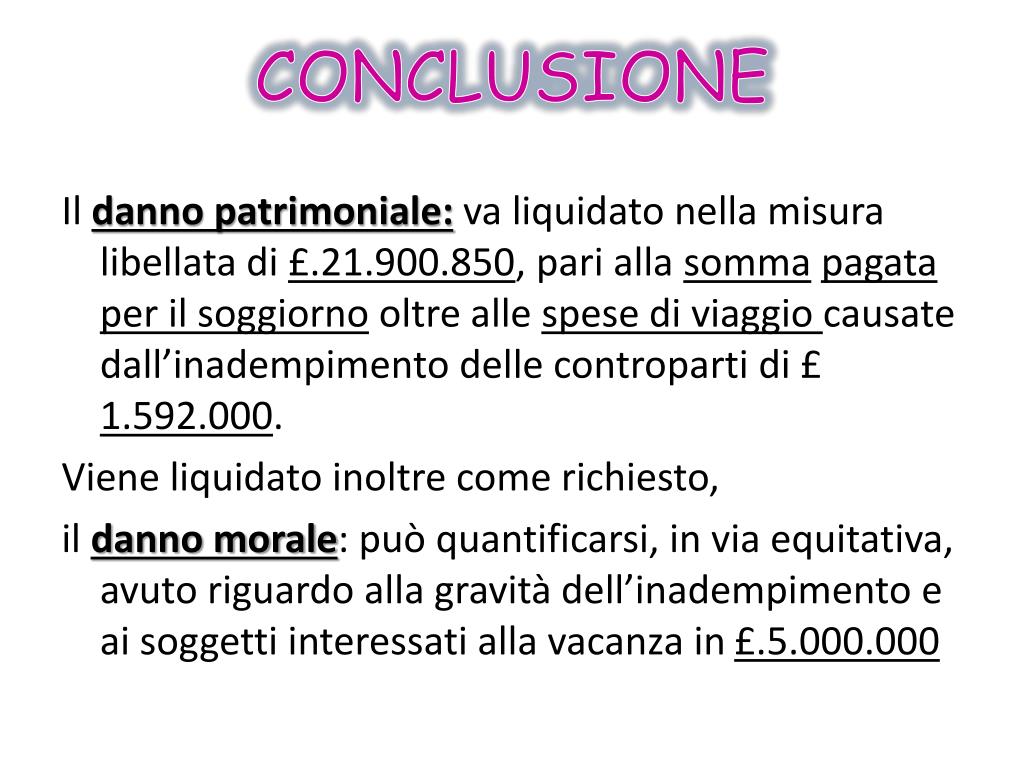 CONCLUSIONE Il danno patrimoniale:va liquidato nella misura libellata di £.21.900.850, pari alla sommapagata per il soggiorno oltre alle spese di viaggio causate dall’inadempimento delle controparti di £ 1.592.000. Viene liquidato inoltre come richiesto, il danno morale:può quantificarsi, in via equitativa, avuto riguardo alla gravità dell’inadempimento e ai soggetti interessati alla vacanza in £.5.000.000