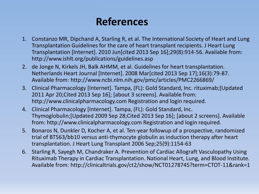 References Constanzo MR, Dipchand A, Starling R, et al. The International Society of Heart and Lung Transplantation Guidelines for the care of heart transplant recipients. J Heart Lung Transplantation [Internet]. 2010 Jun[cited 2013 Sep 16];29(8):914-56. Available from: http://www.ishlt.org/publications/guidelines.asp de Jonge N, Kirkels JH, Balk AHMM, et al. Guidelines for heart transplantation. Netherlands Heart Journal [Internet]. 2008 Mar[cited 2013 Sep 17];16(3):79-87. Available from: http://www.ncbi.nlm.nih.gov/pmc/articles/PMC2266869/ Clinical Pharmacology [Internet]. Tampa, (FL): Gold Standard, Inc. rituximab;[Updated 2011 Apr 20;Cited 2013 Sep 16]; [about 3 screens]. Available from: http://www.clinicalpharmacology.com Registration and login required. Clinical Pharmacology [Internet]. Tampa, (FL): Gold Standard, Inc. Thymoglobulin;[Updated 2009 Sep 28;Cited 2013 Sep 16]; [about 2 screens]. Available from: http://www.clinicalpharmacology.com Registration and login required. Bonaros N, Dunkler D, Kocher A, et al. Ten-year followup of a prospective, randomized trial of BT563/bb10 versus anti-thymocyte globulin as induction therapy after heart transplantation. J Heart Lung Transplant 2006 Sep;25(9):1154-63 Starling R, Sayegh M, Chandraker A. Prevention of Cardiac Allograft Vasculopathy Using Rituximab Therapy in Cardiac Transplantation. National Heart, Lung, and Blood Institute. Available from: http://clinicaltrials.gov/ct2/show/NCT01278745?term=CTOT-11&rank=1
