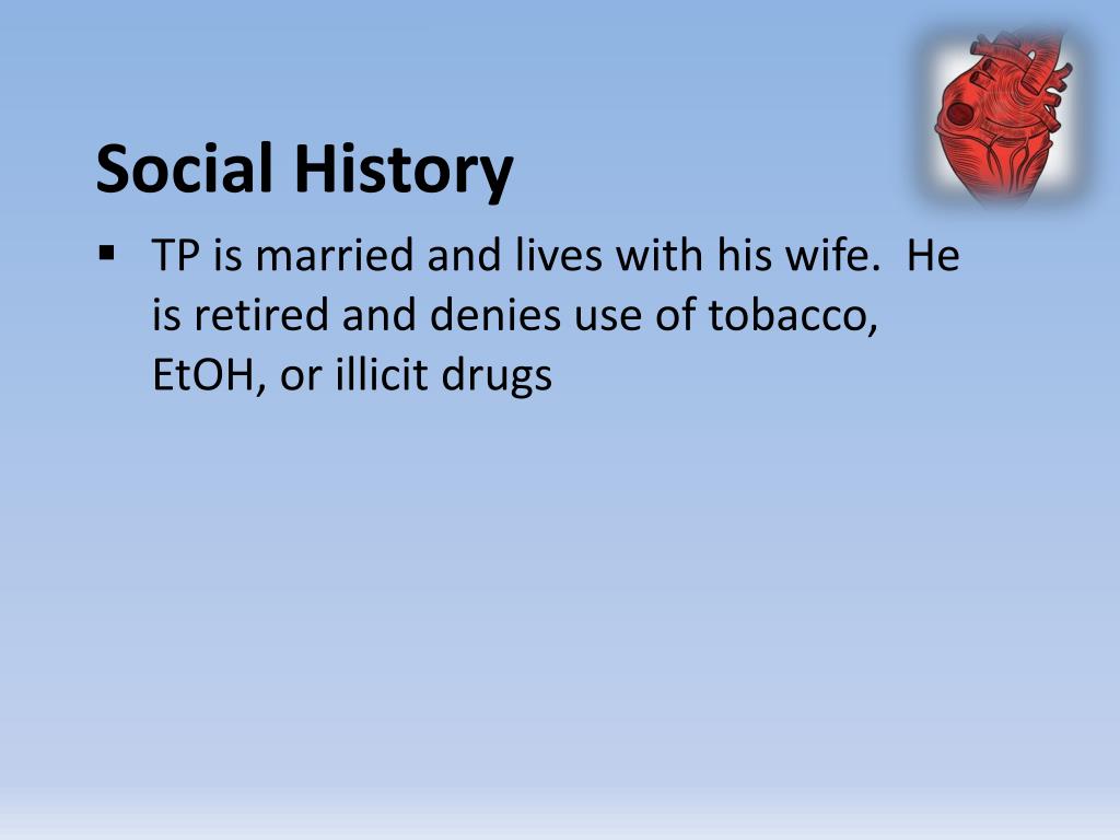 Social History TP is married and lives with his wife. He is retired and denies use of tobacco, EtOH, or illicit drugs