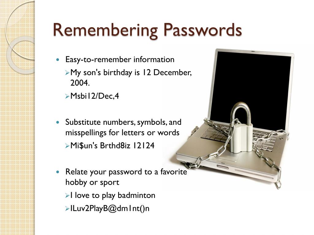 Remembering Passwords • Easy-to-remember information • My son's birthday is 12 December, 2004. • Msbi12/Dec,4 • Substitute numbers, symbols, and misspellings for letters or words • Mi$un's Brthd8iz 12124 • Relate your password to a favorite hobby or sport • I love to play badminton • ILuv2PlayB@dm1nt()n