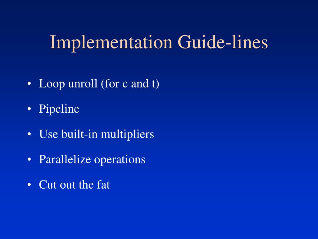 Implementation Guide-lines • Loop unroll (for c and t) • Pipeline • Use built-in multipliers • Parallelize operations • Cut out the fat