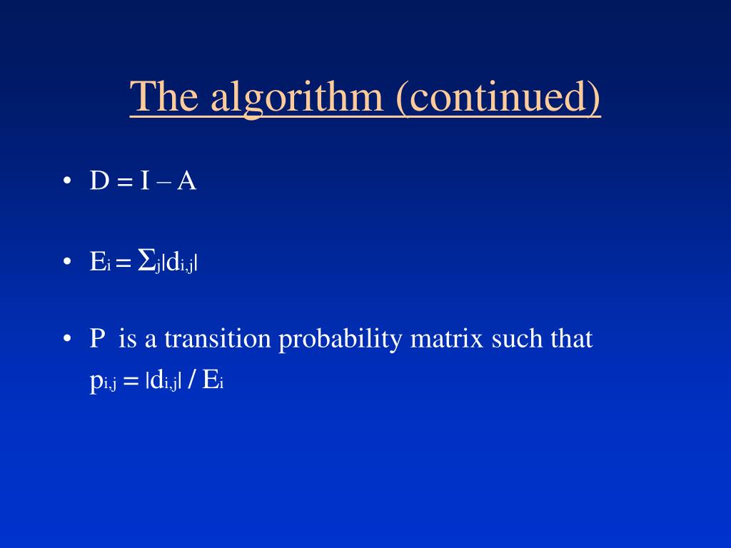 The algorithm (continued) • D = I – A • Ei =Σj|di,j| • P is a transition probability matrix such that pi,j= |di,j| /Ei