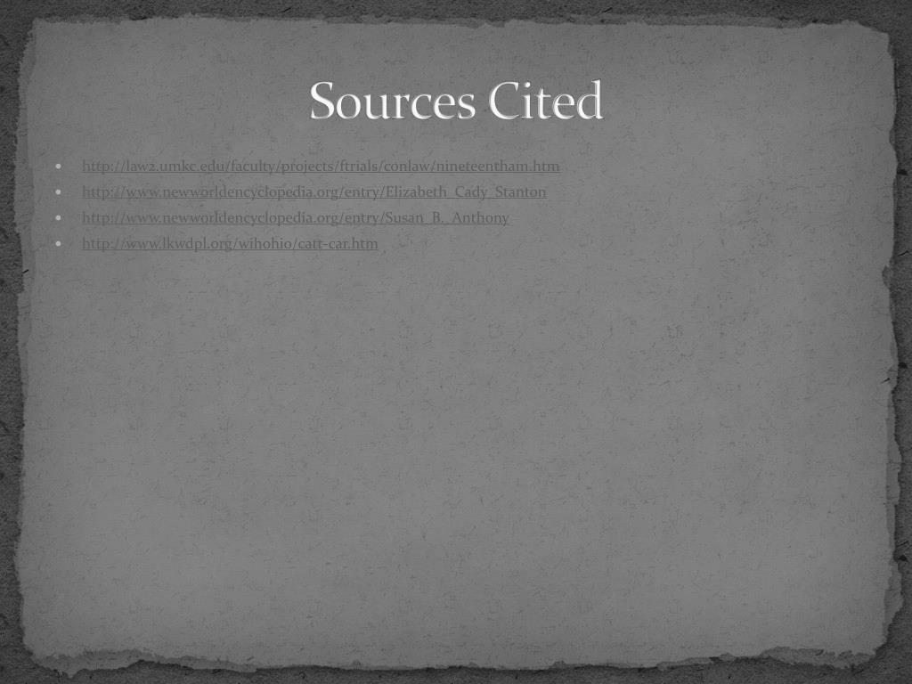 Sources Cited • http://law2.umkc.edu/faculty/projects/ftrials/conlaw/nineteentham.htm • http://www.newworldencyclopedia.org/entry/Elizabeth_Cady_Stanton • http://www.newworldencyclopedia.org/entry/Susan_B._Anthony • http://www.lkwdpl.org/wihohio/catt-car.htm