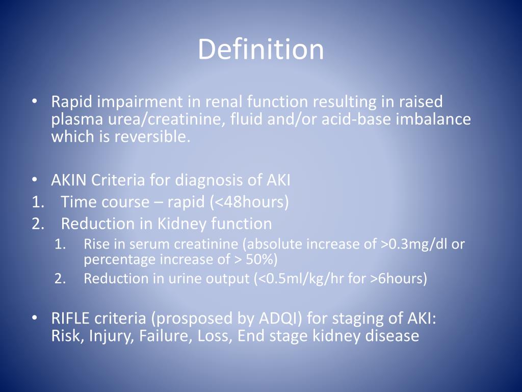 Definition • Rapid impairment in renal function resulting in raised plasma urea/creatinine, fluid and/or acid-base imbalance which is reversible. • AKIN Criteria for diagnosis of AKI • Time course – rapid (<48hours) • Reduction in Kidney function • Rise in serum creatinine (absolute increase of >0.3mg/dl or percentage increase of > 50%) • Reduction in urine output (<0.5ml/kg/hr for >6hours) • RIFLE criteria (prosposed by ADQI) for staging of AKI: Risk, Injury, Failure, Loss, End stage kidney disease
