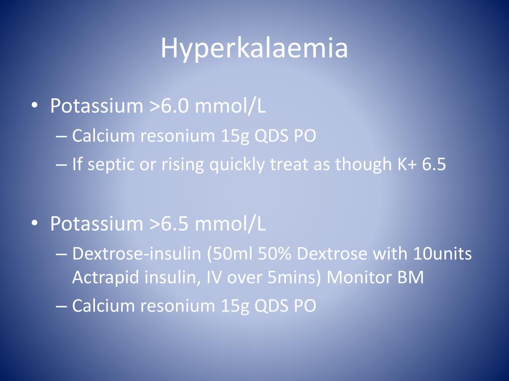 Hyperkalaemia • Potassium >7 mmol/L • Calcium gluconate (10ml of 10% solution into central vein or diluted into 40ml 0.9% saline into peripheral vein over 10mins, with cardiac monitor) • Dextrose insulin • Nebulised salbutamol 5mg • IV sodium bicarbonate (50ml 8.4% over 5mins centrally or 500mls 1.26% over 30mins peripherally • Calcium resonium