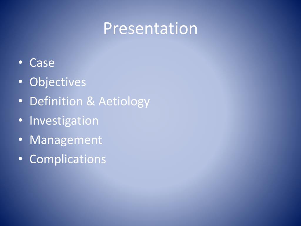 Presentation • Case • Objectives • Definition & Aetiology • Investigation • Management • Complications