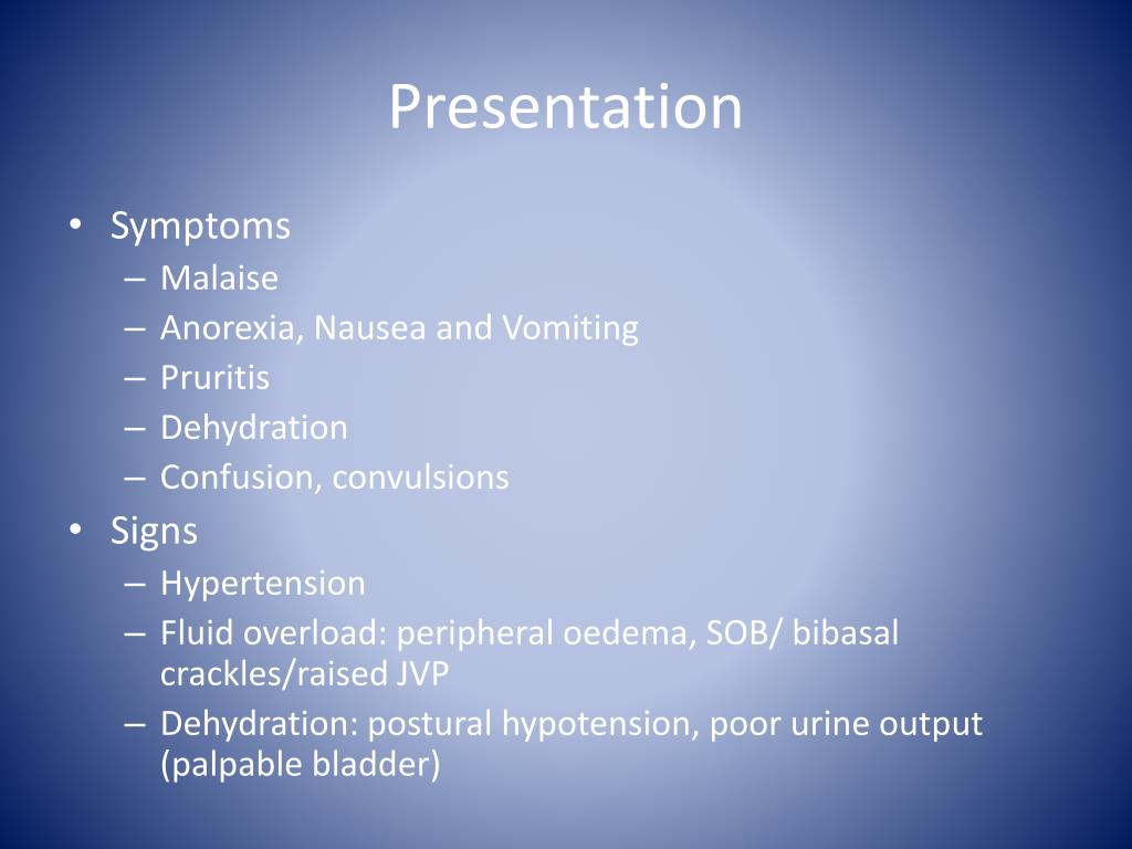 Presentation • Symptoms • Malaise • Anorexia, Nausea and Vomiting • Pruritis • Dehydration • Confusion, convulsions • Signs • Hypertension • Fluid overload: peripheral oedema, SOB/ bibasal crackles/raised JVP • Dehydration: postural hypotension, poor urine output (palpable bladder)