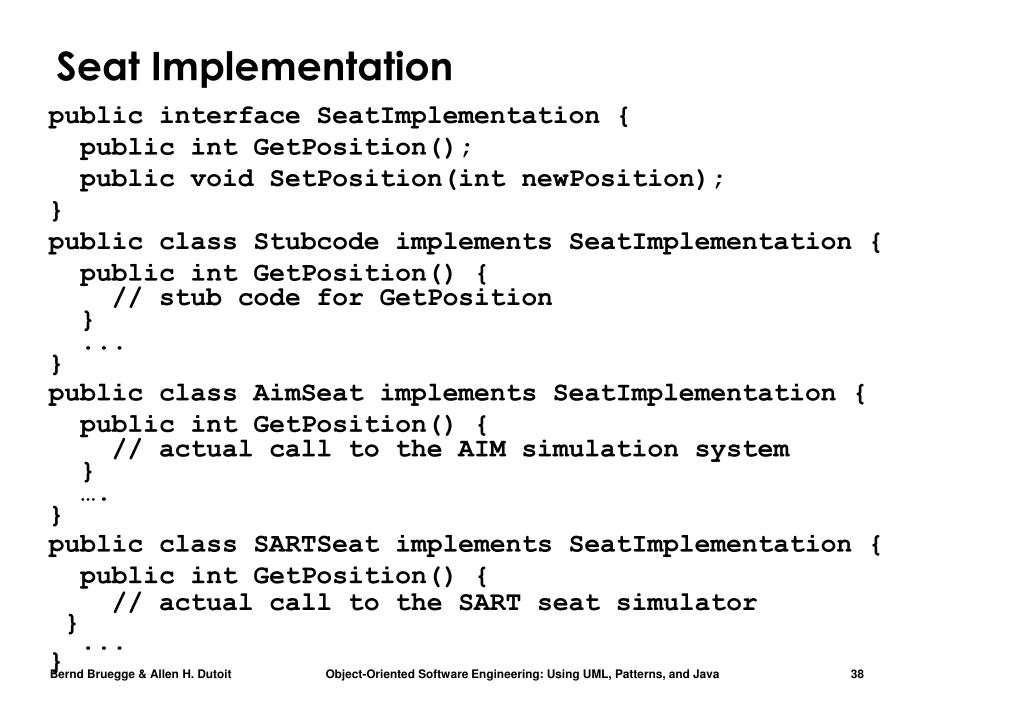 Seat Implementation public interface SeatImplementation { public int GetPosition(); public void SetPosition(int newPosition); } public class Stubcode implements SeatImplementation { public int GetPosition() { // stub code for GetPosition } ... } public class AimSeat implements SeatImplementation { public int GetPosition() { // actual call to the AIM simulation system } …. } public class SARTSeat implements SeatImplementation { public int GetPosition() { // actual call to the SART seat simulator } ... }