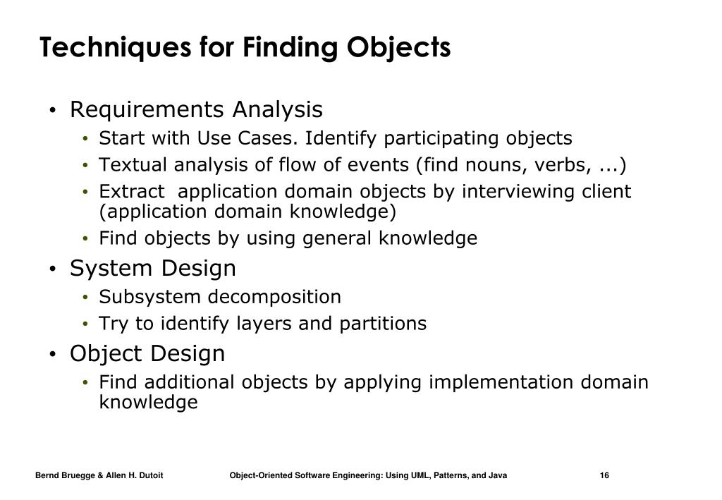 Finding Objects • The hardest problems in object-oriented system development are: • Identifying objects • Decomposing the system into objects • Requirements Analysis focuses on application domain: • Object identification • System Design addresses both, application and implementation domain: • Subsystem Identification • Object Design focuses on implementation domain: • Additional solution objects