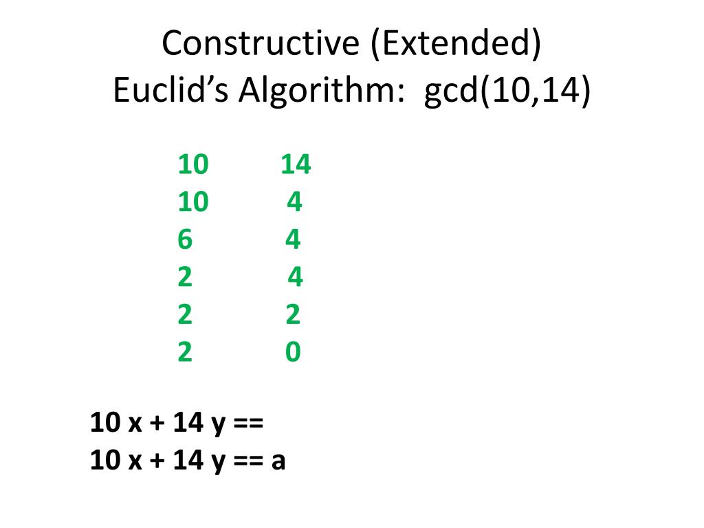 Constructive (Extended) Euclid’s Algorithm: gcd(10,14) 10 1410 4 6 4 4 2 2 2 0 10 x + 14 y == 10 x + 14 y == a