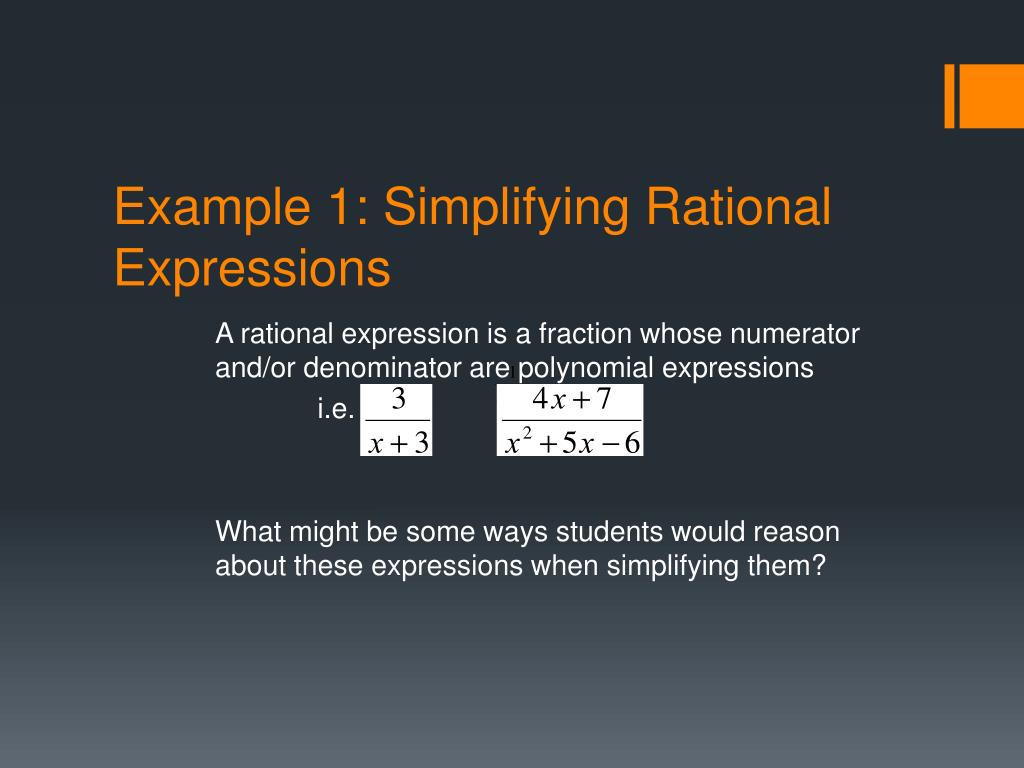 Example 1: Simplifying Rational Expressions A rational expression is a fraction whose numerator and/or denominator are polynomial expressions i.e. What might be some ways students would reason about these expressions when simplifying them?