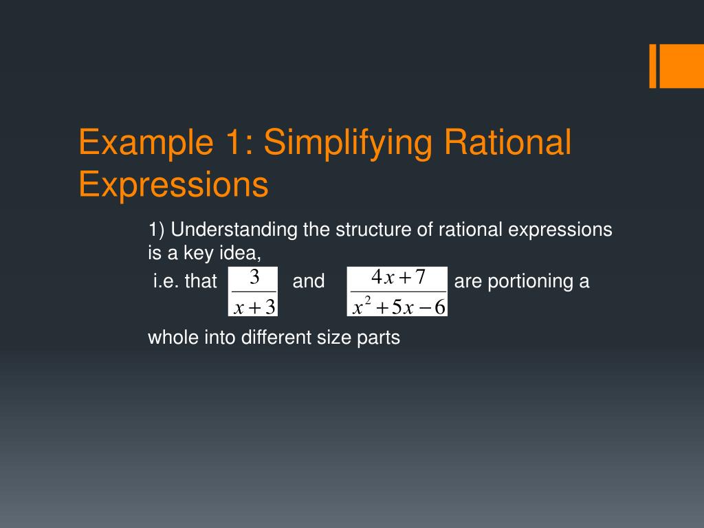 Example 1: Simplifying Rational Expressions 1) Understanding the structure of rational expressions is a key idea, i.e. that and are portioning a whole into different size parts