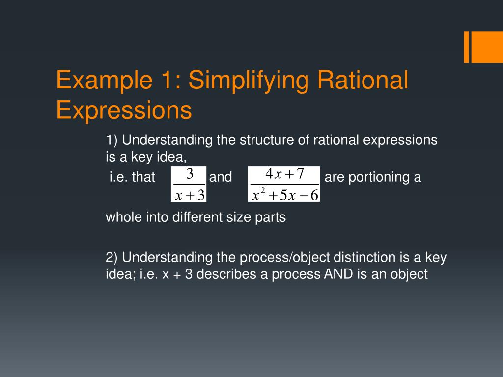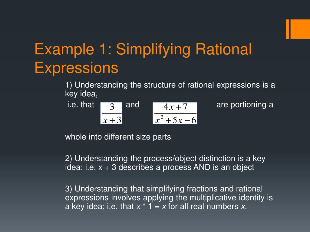 Example 1: Simplifying Rational Expressions 1) Understanding the structure of rational expressions is a key idea, i.e. that and are portioning a whole into different size parts 2) Understanding the process/object distinction is a key idea; i.e. x + 3 describes a process AND is an object 3) Understanding that simplifying fractions and rational expressions involves applying the multiplicative identity is a key idea; i.e. that x * 1 = x for all real numbers x.