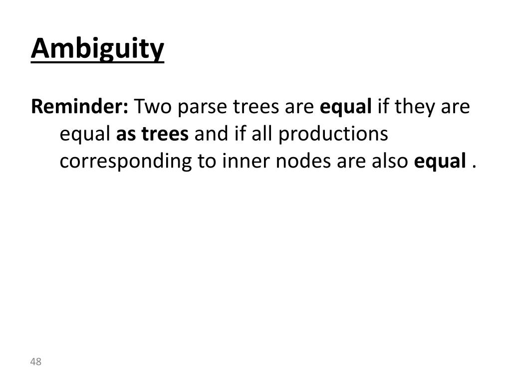 Ambiguity Reminder: Two parse trees are equal if they are equal as trees and if all productions corresponding to inner nodes are also equal .
