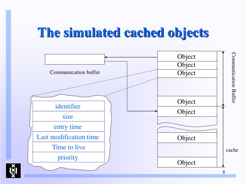 The simulated cached objects Object Communication Buffer Object Communication buffer Object Object identifier Object size entry time Last modification time Object Time to live cache priority Object