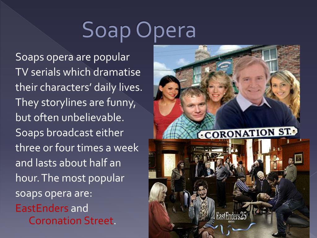 Soap Opera Soaps opera are popular TV serials which dramatise their characters’ daily lives. They storylines are funny, but often unbelievable. Soaps broadcast either three or four times a week and lasts about half an hour. The most popular soaps opera are: EastEnders and Coronation Street.