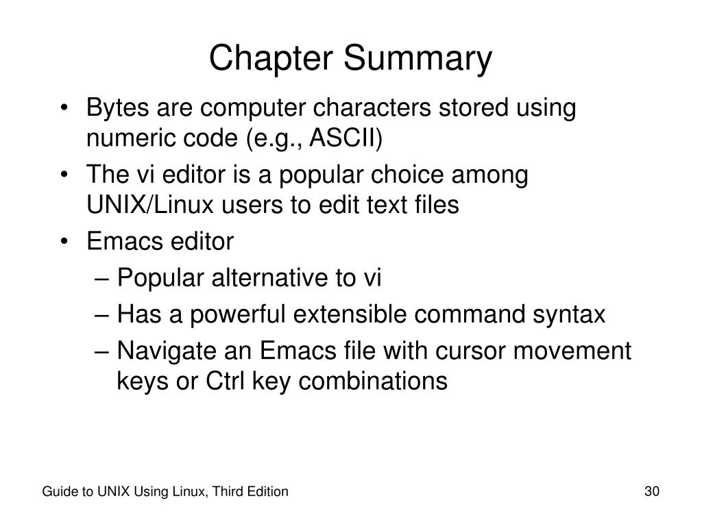 Chapter Summary • Bytes are computer characters stored using numeric code (e.g., ASCII) • The vi editor is a popular choice among UNIX/Linux users to edit text files • Emacs editor • Popular alternative to vi • Has a powerful extensible command syntax • Navigate an Emacs file with cursor movement keys or Ctrl key combinations Guide to UNIX Using Linux, Third Edition