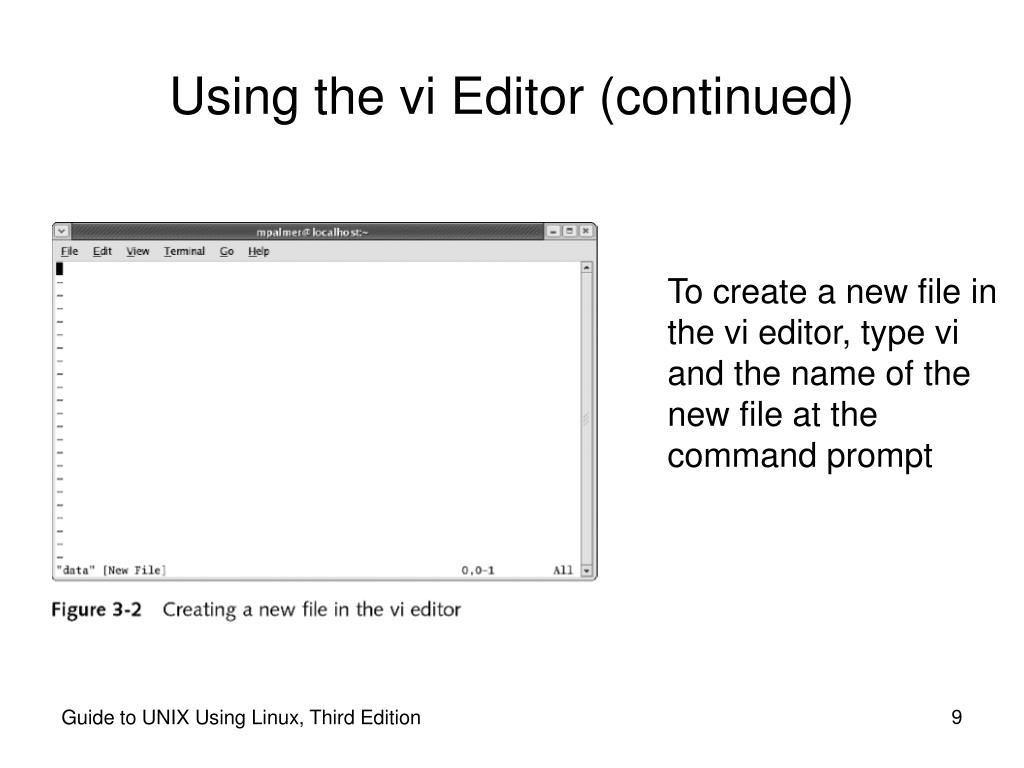Using the vi Editor (continued) To create a new file in the vi editor, type vi and the name of the new file at the command prompt Guide to UNIX Using Linux, Third Edition