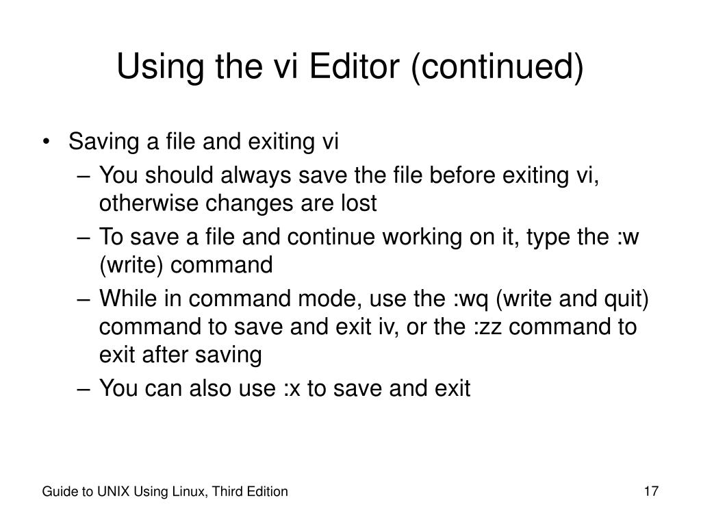 Using the vi Editor (continued) • Saving a file and exiting vi • You should always save the file before exiting vi, otherwise changes are lost • To save a file and continue working on it, type the :w (write) command • While in command mode, use the :wq (write and quit) command to save and exit iv, or the :zz command to exit after saving • You can also use :x to save and exit Guide to UNIX Using Linux, Third Edition