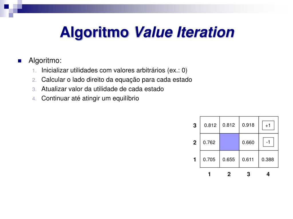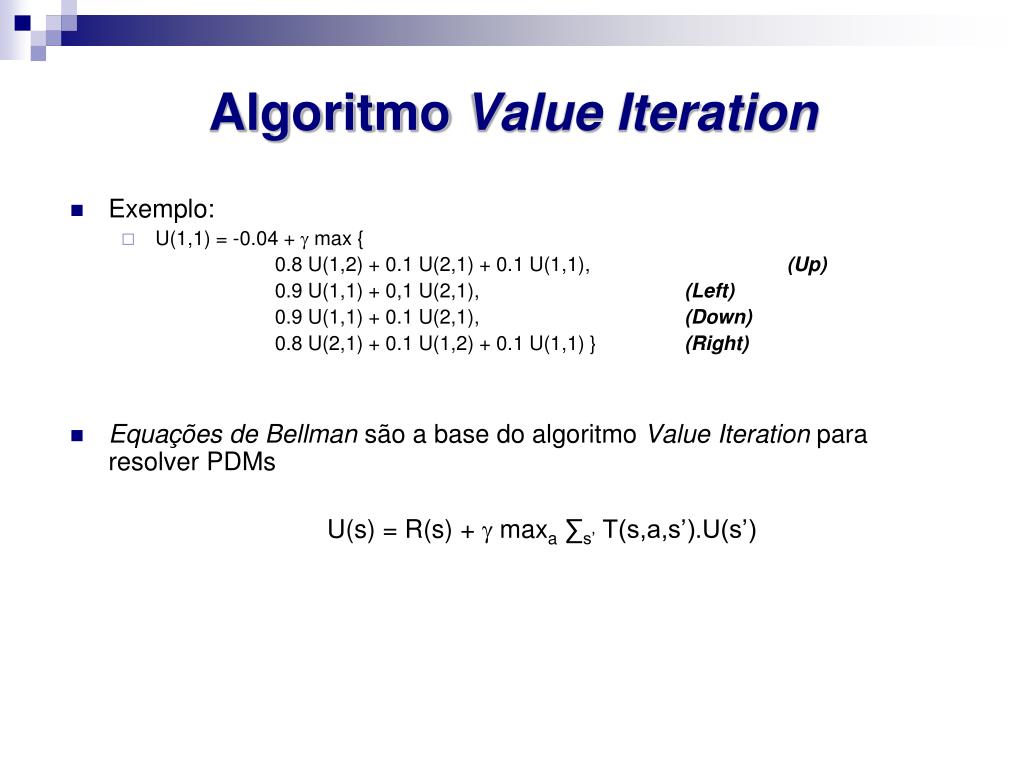 Algoritmo Value Iteration • Exemplo: • U(1,1) = -0.04 + max { 0.8 U(1,2) + 0.1 U(2,1) + 0.1 U(1,1), (Up) 0.9 U(1,1) + 0,1 U(2,1), (Left) 0.9 U(1,1) + 0.1 U(2,1), (Down) 0.8 U(2,1) + 0.1 U(1,2) + 0.1 U(1,1) } (Right) • Equações de Bellman são a base do algoritmo Value Iteration para resolver PDMs U(s) = R(s) + maxa∑s’ T(s,a,s’).U(s’)